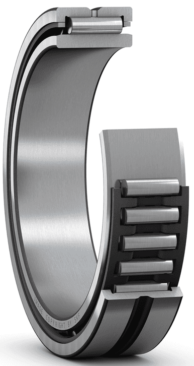 Single row needle roller bearings incorporate cylindrical rollers that are small in diameter relative to their length. Owing to their large number of rollers, the bearings have a high load carrying capacity. The outer ring includes two integral flanges to guide the bearing axially and an annular groove with one or more lubrication holes to facilitate relubrication.